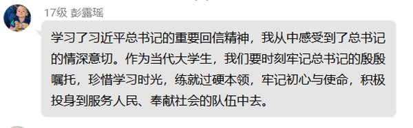于是员工党员们积极发言,周英豪同学讲到,学习习近平总书记重要回信精神,我明确了作为员工党员,更需要珍惜学习时光,练就过硬本领,学会明辨,也要笃实,会当水击三千里,乱云飞渡仍从容!彭露瑶同学讲到,学习了习近平总书记的重要回信精神,我从中感受到了总书记的情深意切。作为当代老员工,我们要时刻牢记总书记的殷殷嘱托,珍惜学习时光,练就过硬本领,牢记初心与使命,积极投身到服务人民、奉献社会的队伍中去。
