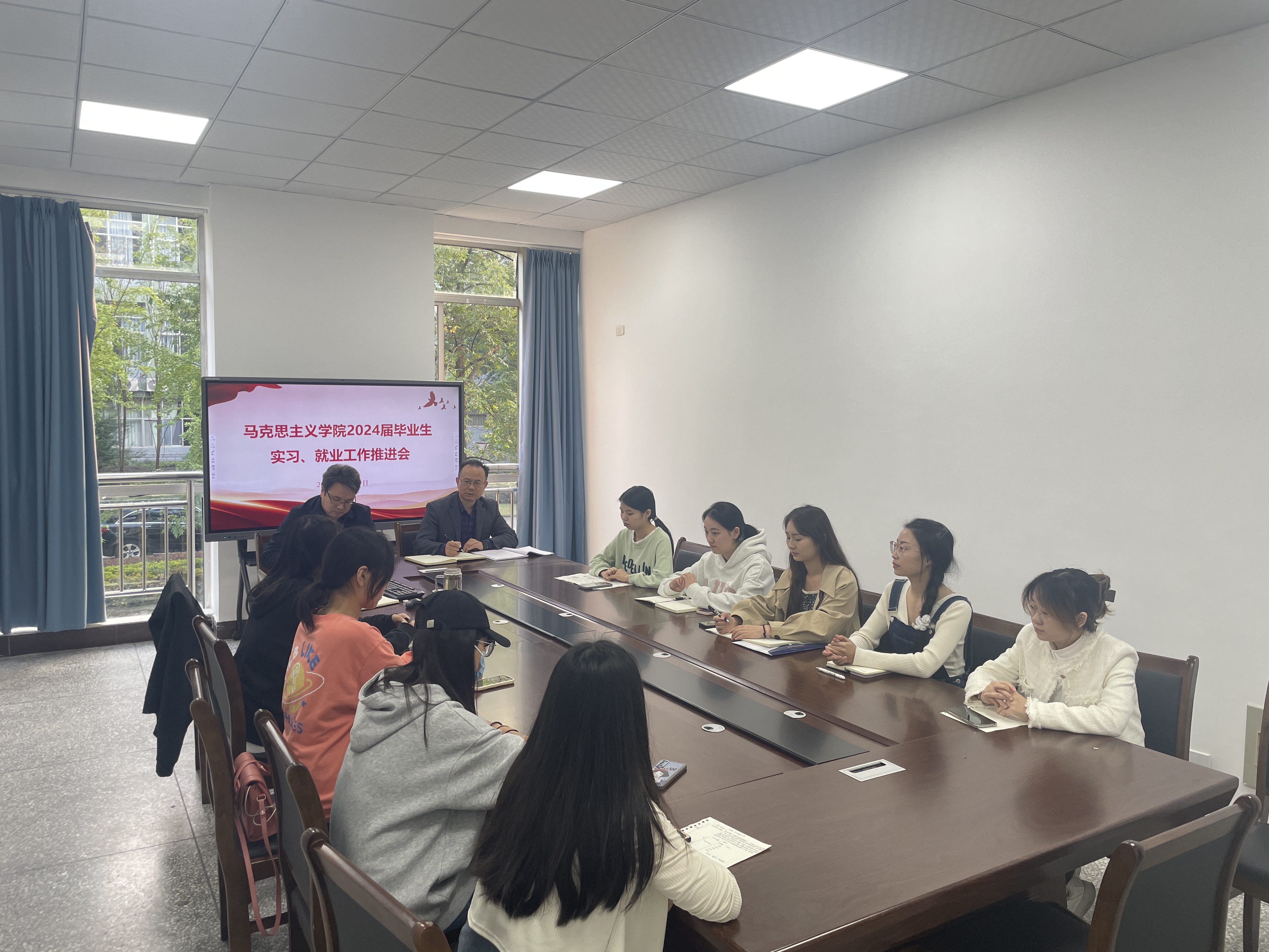 近日,太阳集团tyc4633在知津楼B210会议室召开2024届毕业生实习交流暨就业工作推进会,学院经理胡守敏、党总支书记杨正强、毕业班辅导员李华夏,非考研的10余名员工代表参加会议。会议由学院学工办主任李华夏主持。