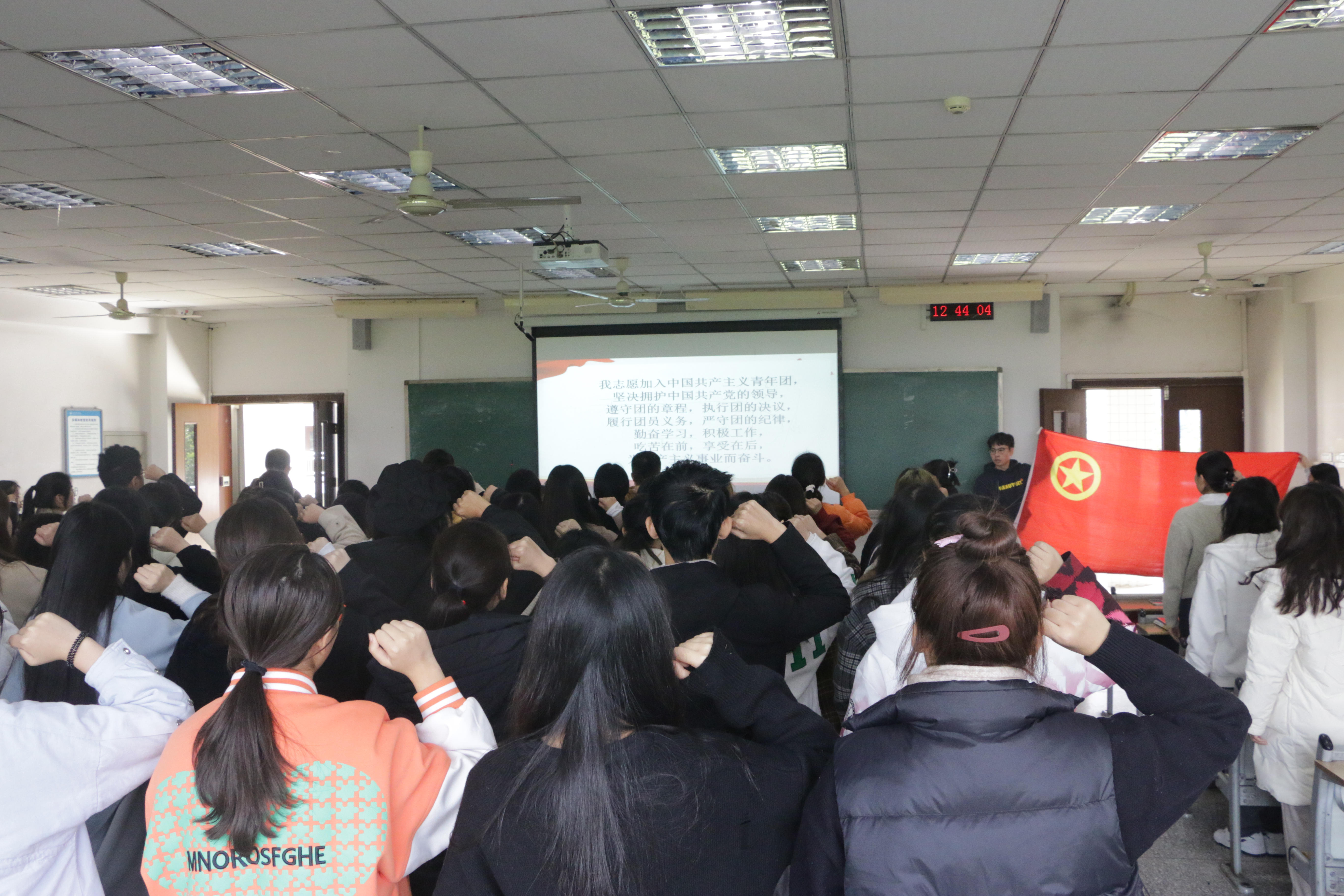开班仪式中,学员高唱团歌、重温入团誓词,面对团旗庄严宣誓。学员代表杨帧淇在发言中代表全体学员作出承诺:严格遵守团校各项规定,积极配合团校工作,主动在学习和生活中践行自己的诺言,为实现中华民族伟大复兴而努力奋斗。